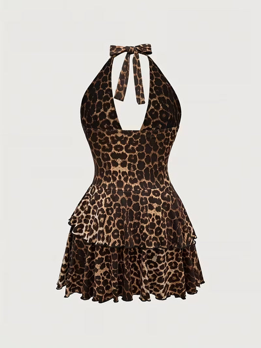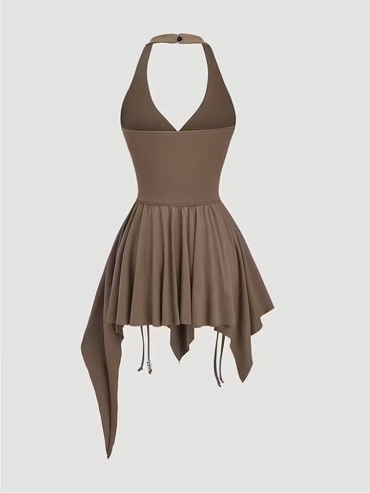 Sleeveless Ruched Halterneck Dress In Coffee Color
