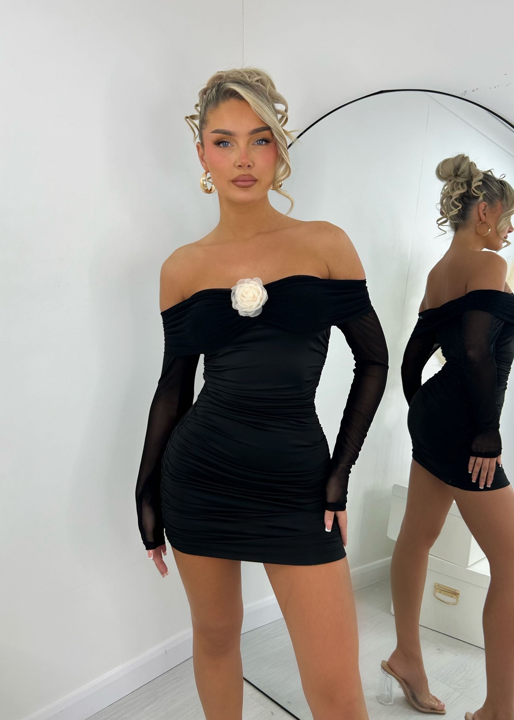 Elevate your style in our Tough Lover dress! This captivating black mini dress features a flattering off the shoulder design and elegant long sleeves. The white corsage detail adds a touch of romance and draws attention to the shoulders. Perfect for a night out, this dress will make you feel confident and alluring.